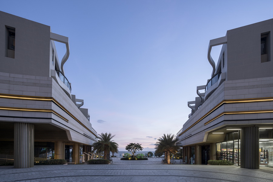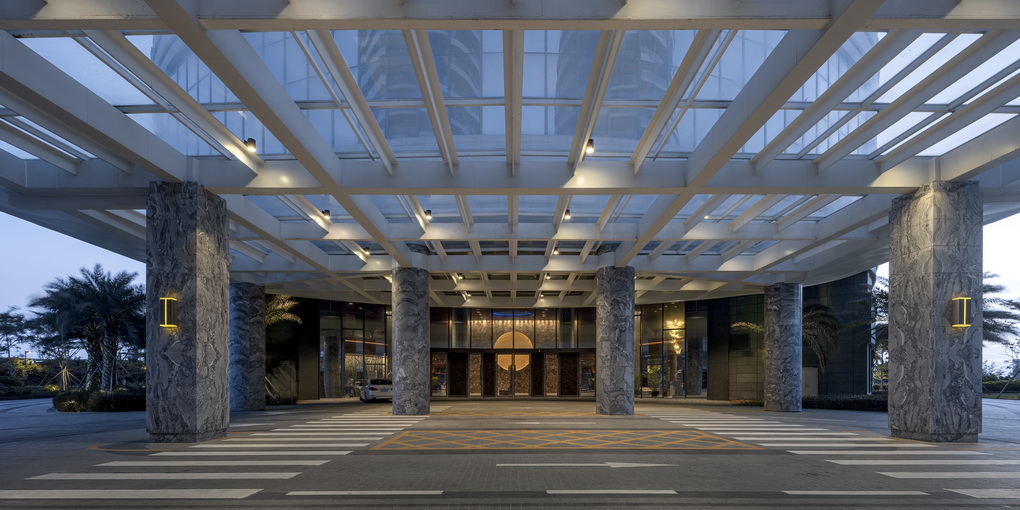 Respecting the small volumes of the fishing village and the natural growth of traffic flow, a relatively small volume of low-rise buildings are place at the main pedestrian access to the beach. These are hotel villas to reproduce the spatial dimensions of the fishing village, and meanwhile help to create comfortable spatial experience at the beach side. Hotel villas scatter like a natural village, while each can enjoy the unobstructed sea view. There is an axis within the overall layout, from the hotel main entrance, to the plaza and the entrance open area, and then to the beach space. The spaces are rich and full of fun. A large glass awning sitting between the three high-rise buildings is the hotel's drop-off area. Large awning canopy connects the semi-open lobby space, forming sequences, creating a sense of ceremony as the guests enter the hotel.