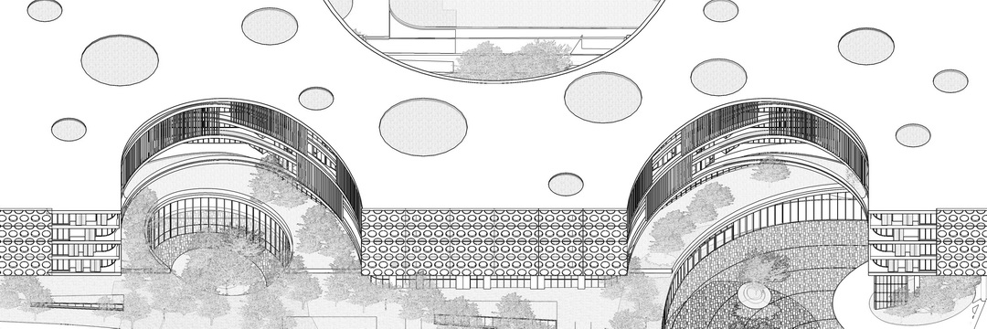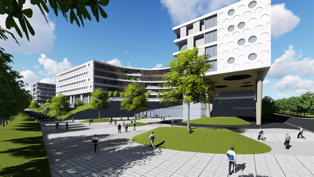 本项目位于南京市栖霞区,钟山学院校区内一角,地块狭长,南北向约 200m,东西向 80m,建设规划容积率高达 3.5。南京康复医院设计研究的出发点在于给休养的病人提供绿色生态的休养场所,活泼有趣的医疗空间。改变人们对于传统医院冰冷刻板的空间和形体认知。